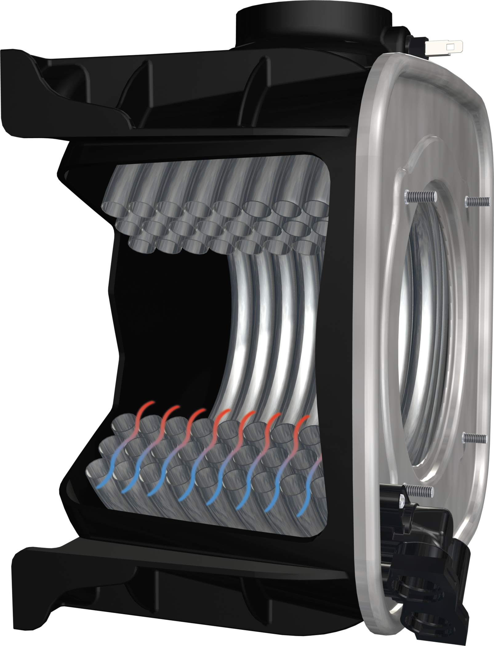 - Первинний теплообмінник C.R.V. з водяних труб, виготовлених із нержавіючої сталі AISI 316Ti (патент).